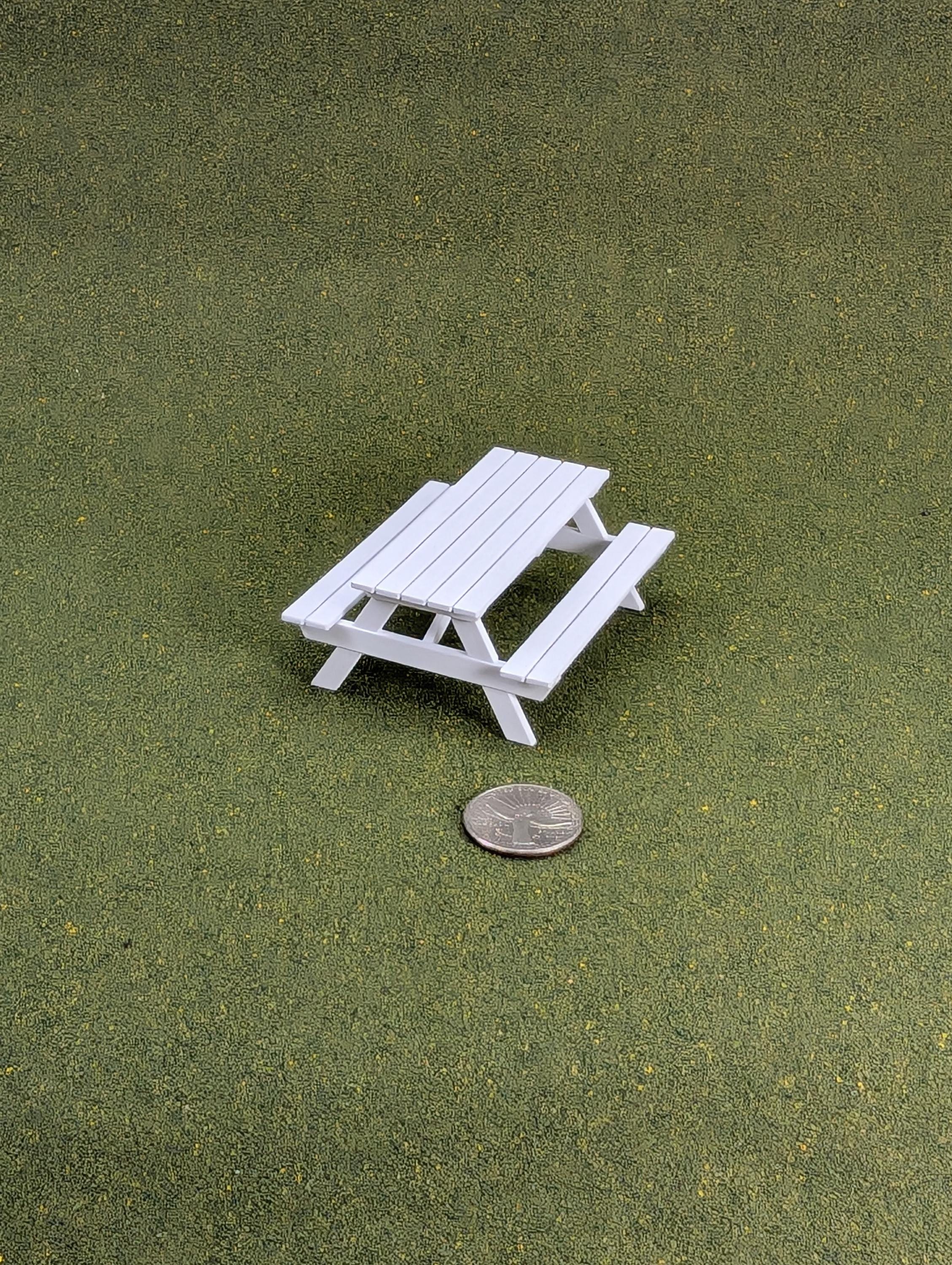 This is a custom-designed and 3D printed picnic table in 1:24 scale.