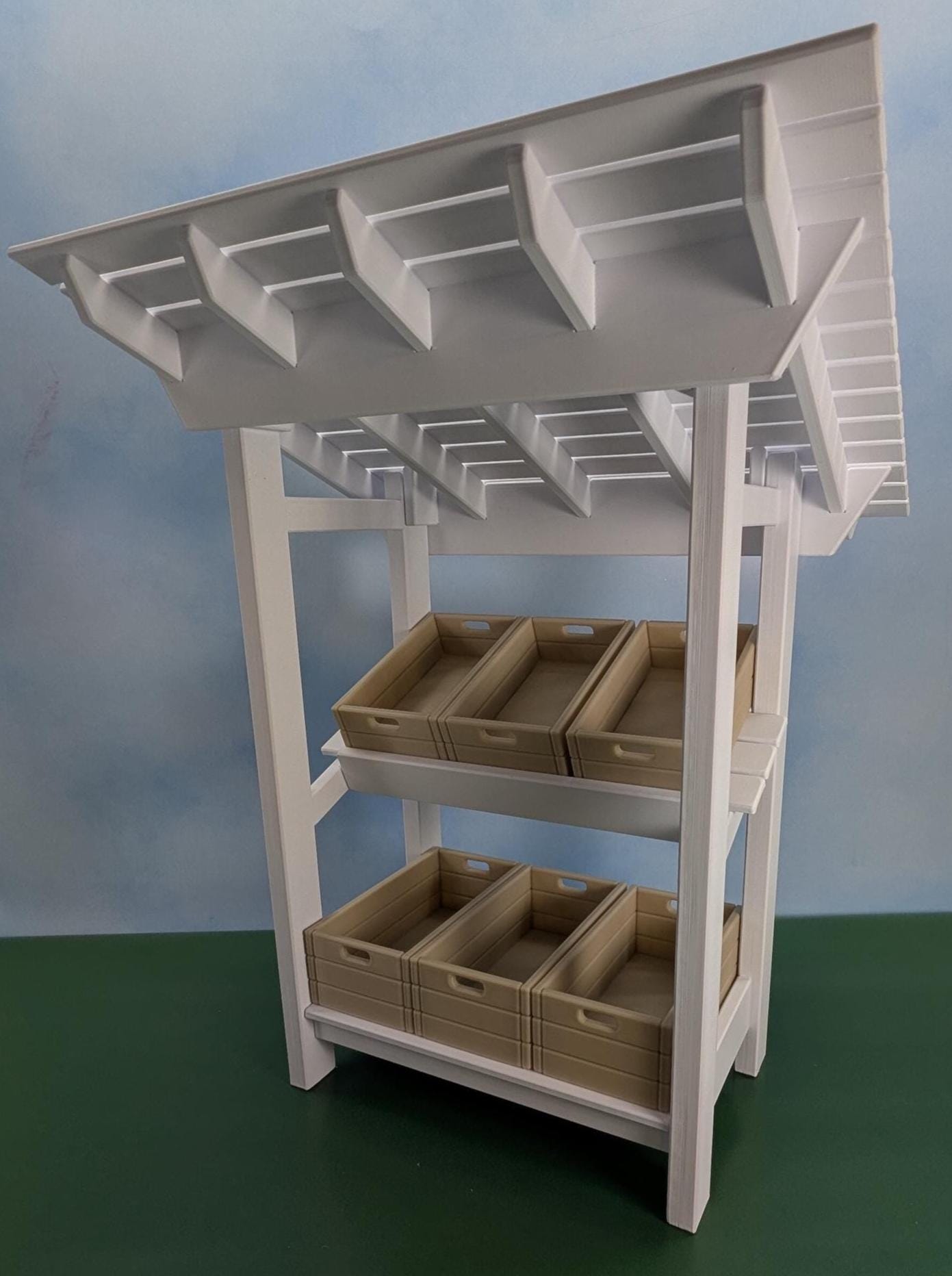 We are pleased to offer this unique, custom-designed 3D-printed Farmers Market Stand. This is a 1:6 scale model and can be used as a table display for a party or shower. 6 crates, 3 large and 3 small, are included. Crate color is beige but we‘re happy to print in other colors so please contact us for more information.