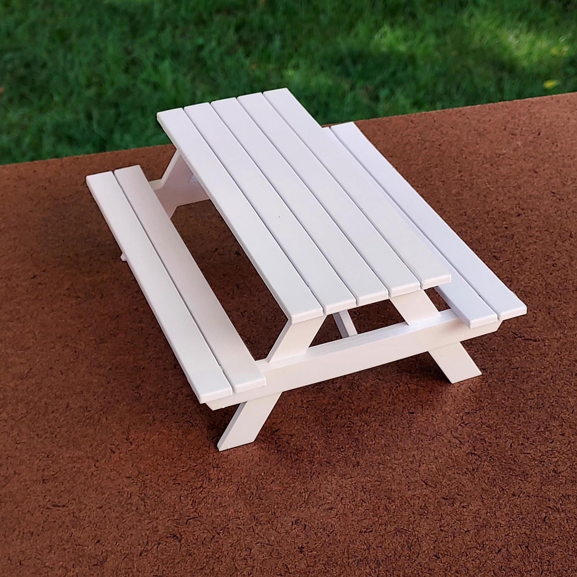 Our custom-designed picnic table will look wonderful on your doll house porch, miniature outdoor garden, or backyard play patio. This 1:12 scale model is sturdy and suitable for supervised play by children.